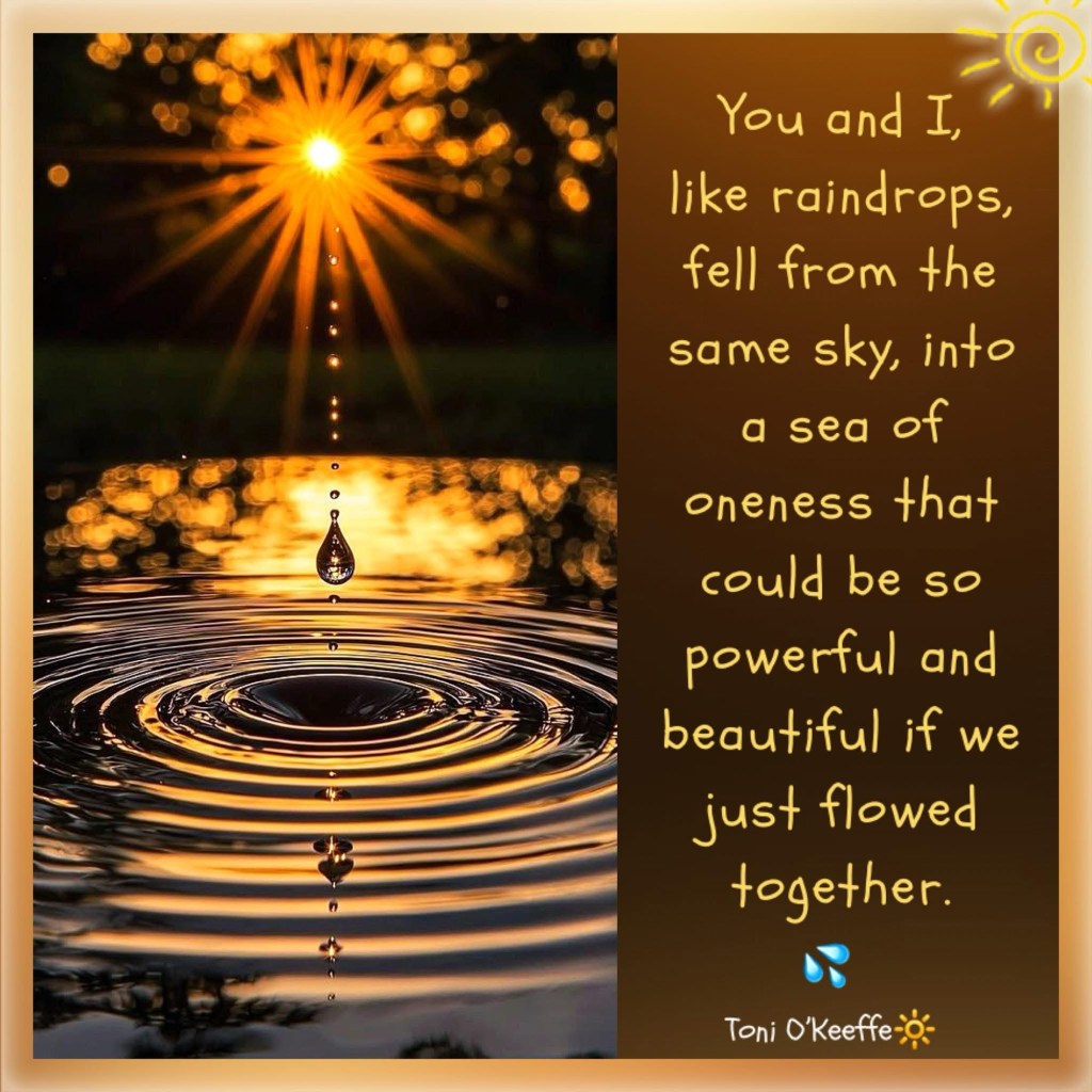 Eventually, like rain drops, we arrive at a vast sea of oneness where we finally realize we’re connected, powerful, beautiful and strong, when we flow together.