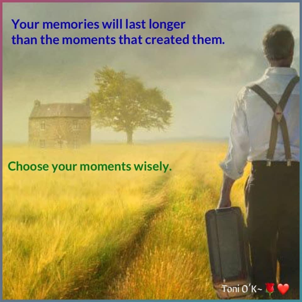 Every moment matters. With every decision you make, you’re paving the path that all your memories will be built upon. You’re choosing to move towards your dreams or away from them. You’re choosing to heal or suffer. You’re choosing to seize an opportunity or let it pass. You’re choosing to speak your truth or fall silent. You’re choosing kindness or cruelty. You’re choose tolerance or judgement. Your memories will last longer than the moments that created them. Choose your moments wisely. Toni O’K~🌹❤️