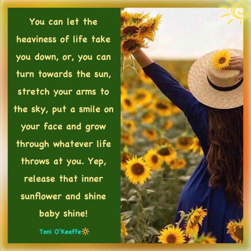 You can let the heaviness of life take you down, or, you can turn towards the sun, stretch your arms to the sky, put a smile on your face and grow through whatever life throws at you. Yep, release your inner sunflower and shine baby shine! Toni OâKeeffeđ