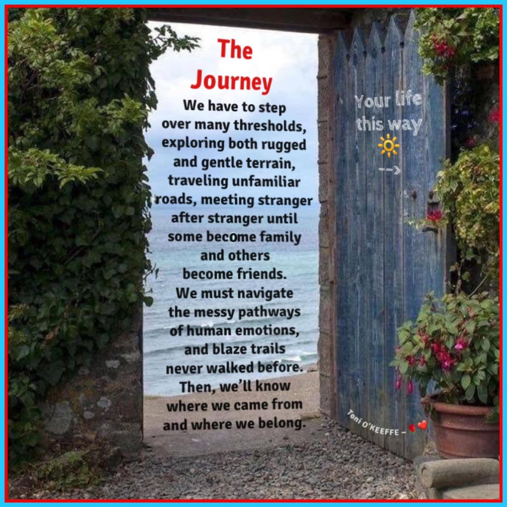 We have to step over many thresholds, exploring both rugged and gentle terrain. Traveling unfamiliar roads, meeting stranger after stranger until some become family and others become friends.