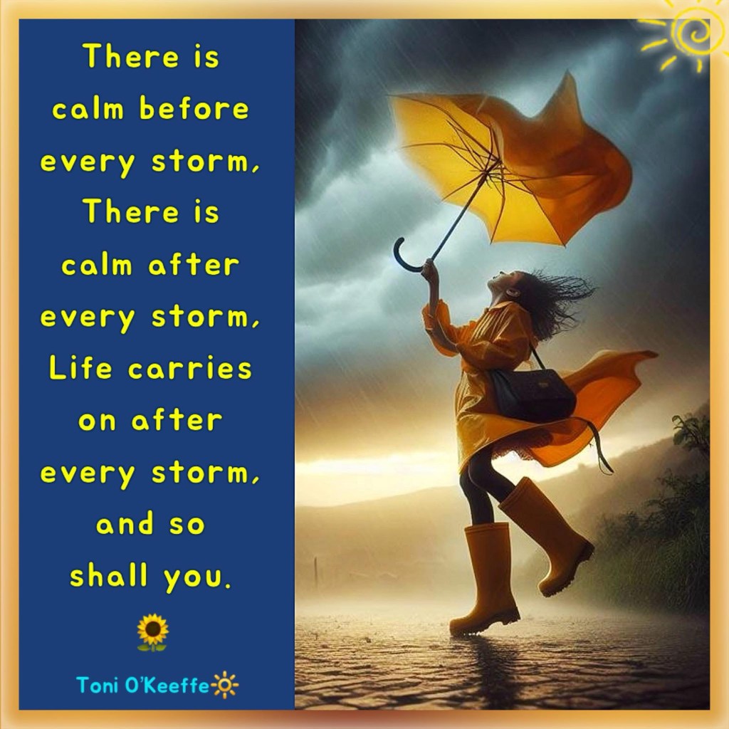 Our lives are an amazing and colourful adventure of, sunshine filled days, wild chaotic storms, days that are calm, days that are dull, days that are painful, days that are pleasant, and days that provide a bit of it all. No matter how dark the day has been, the sun stills comes up, the stars still shine, the ocean tides continue to roll in and out and, the wind continues to move the heaviest of clouds revealing blue skies. There is calm before every storm, There will be calm after every storm, Life carries on after every storm, and so shall you❤️.